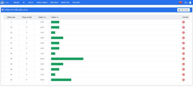 - Bảng này hiển thị ra tổng các cuốc khách theo từng ngày của tháng mà mình muốn tìm kiếm, nhìn ở bảng này ta có được số liệu thống kê của tổng cuốc số cuố thành công theo ngày, tổng số cuốc hủy hoãn theo ngày … Thao tác với bảng như sau: